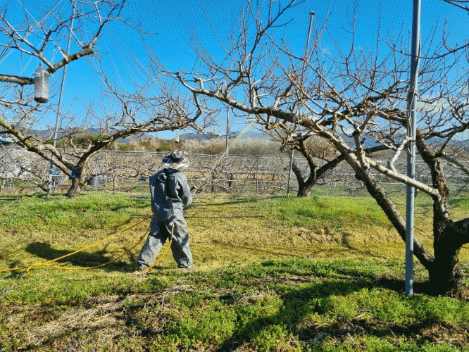기계유유제의 살포는 깍지벌레류 등에 살충효과가 있고 살포 시기는 개화 전 50일 전후로 2월 중·하순 경이며, 석회유황합제는 3월 초·중순 경, 꽃피기 전 15~20일이 적기로 잎 오갈병, 잿빛무늬병 등 병원균과 깍지벌레, 진딧물 등 해충방제에도 효과적이다. 단, 시설하우스의 비닐이나 파이프를 부식시키는 성질이 있으므로 과원 주변 환경을 살펴 사용에 유의해야 한다.