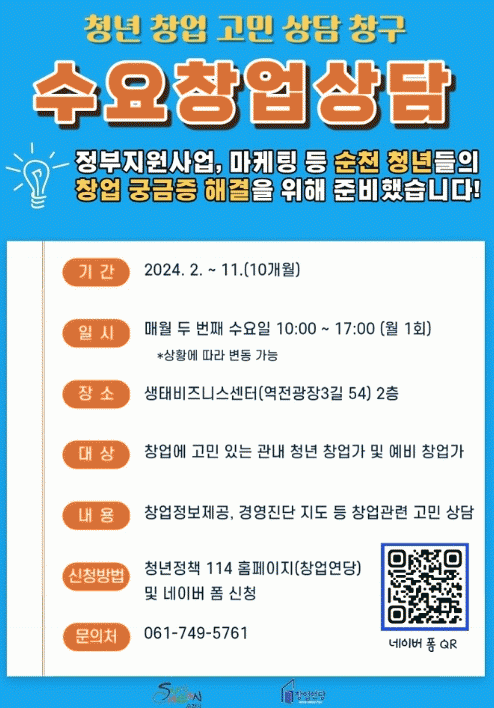 수요창업상담은 2월부터 11월까지, 매월 두 번째 수요일 생태비즈니스센터(역전광장3길 54) 창업연당에서 진행된다.