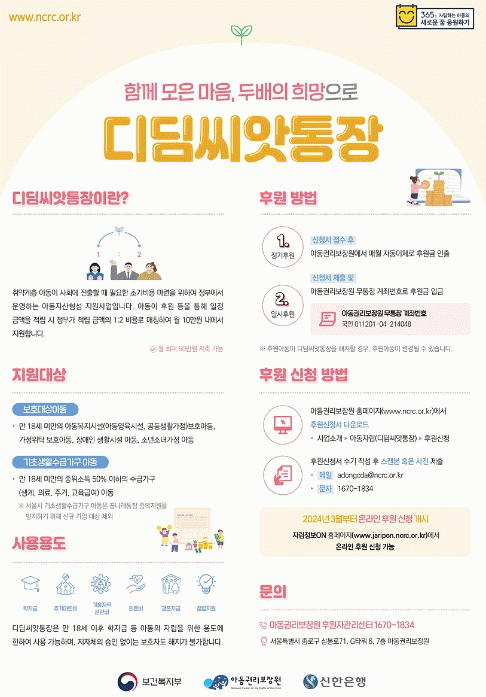 시 관계자는 “디딤씨앗통장은 저소득층 아동들의 안정적 자립에 도움이 되는 만큼 해당 아동은 꼭 신청하셔서 혜택을 받아보시길 바란다”고 전했다.