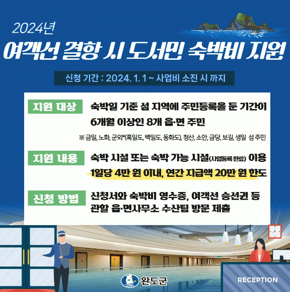 군은 지난 2021년 12월 '완도군 연안 여객선 이용 섬 주민 숙박비 지원 조례'를 제정하고, 2022년 하반기부터 2023년까지 총 330명의 섬 주민들에게 숙박비를 지원했다.