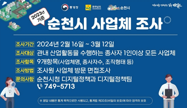조사대상은 2023년 12월 말을 기준으로 순천시에서 산업활동을 수행하는 1인 이상의 사업체인 3만 6,373개소다.
