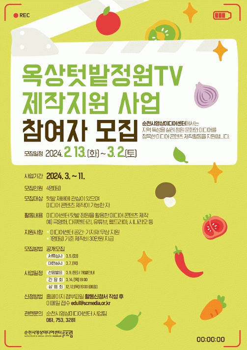 텃밭 재배에 관심 있고 미디어 콘텐츠 제작이 가능한 순천시민이라면 누구나 신청 가능하며, 서류·대면 심사를 통해 총 4명(팀)을 지원한다.