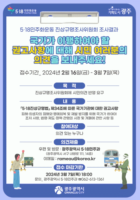 시민 의견접수는 16일부터 3월 7일까지 진행되며, 국가에 대한 권고사항 관련 의견이 있는 시민은 시청을 방문하거나 등기우편(광주광역시 서구 내방로 111, 5·18민주과(치평동)), 이메일로 제출하면 된다.