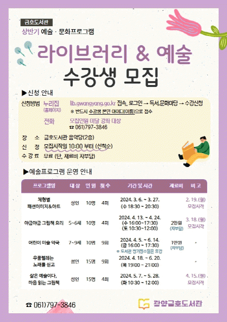 이용민 금호도서관팀장은 “이번 프로그램은 특화 주제인 예술 분야와 도서관 본연의 핵심 소재인 독서 관련한 과정으로 다양하게 구성했다”며 “지역주민들이 이번 강좌를 계기로 예술의 매력과 독서와 배움의 가치에 매료되길 바란다”고 말했다.