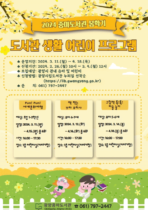 김미라 도서관과장은 “지역 어린이들이 봄학기를 맞아 도서관 생활 어린이 프로그램 참여를 통해 배움의 기쁨을 경험하면서 창의력과 잠재력을 키울 수 있는 계기가 되길 바란다”며 “아이들이 꿈과 희망을 마음껏 펼칠 수 있도록 다양한 독서문화 프로그램 운영할 계획이다”고 말했다.