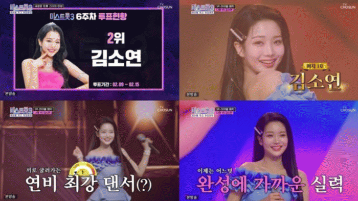 이날 김소연은 6주 차 투표 현황에서 2위로 순위가 상승하며 날로 높아지는 인기를 입증했다. 이어진 라이벌 매치에서 '미스트롯3' TOP14 나영, '미스터트롯2' TOP7 박지현과 팀을 이룬 김소연은 1차 무대에서 우연이의 '그남자' 무대를 선보였다.