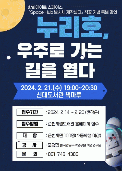 이번 강연은 지난 15일 순천시 율촌 제1산단에 건립되는 한화에어로스페이스 'Space Hub 발사체 제작센터' 착공을 기념하고, 시민들의 우주항공 분야에 대한 관심을 유도하고자 개최한다.