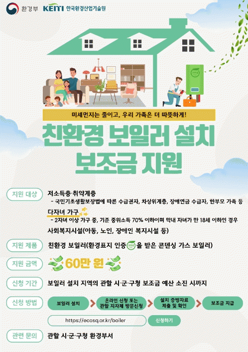 지원 금액은 친환경 보일러 설치비를 보일러 1대당 60만원씩 지원하며, 예산 소진시까지 선착순 접수한다.
