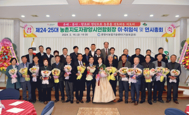 정인화 광양시장은 “농촌지도자회 발전을 위해 애쓴 정양기 전임회장의 노고에 감사드린다”며 “박광기 신임회장을 중심으로 농촌지도자회의 활성화는 물론이고 스마트·디지털·친환경 농업, 청년이 농촌에 살기 위한 여건 마련 등 생동하는 3농(농업·농촌·농민) 정책에 농촌지도자회에서 앞장서는 선도적인 역할을 해줄 것”을 당부했다.