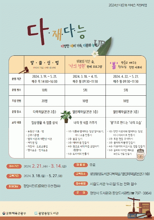 한편, 광양중앙도서관은 지난해에도 『다문화 서비스 지원사업』 공모에 선정돼 '다(多)함께 잡잡잡(job)!'을 주제로 다문화인들이 경제 활동 기반을 마련할 수 있도록 지식과 기술 습득 교육 강좌를 운영한 바 있다.