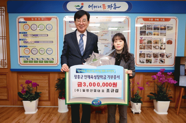같은 날 조규섭 ㈜일쌍산업 대표도 장흥군 인재 육성을 위해 3백만 원을 기탁했다. 농업기계를 생산·조립하는 지역 업체로 알려진 일쌍신업은 2023년에 이어 올해에도 장학금을 전달했다.