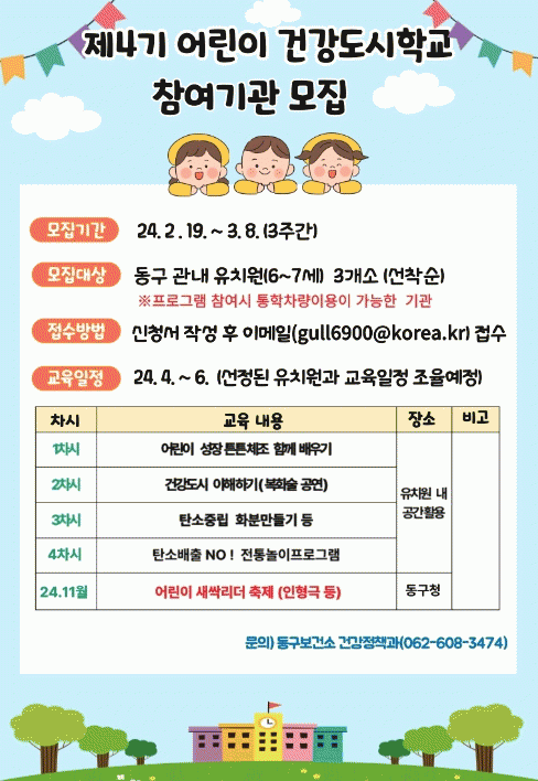 임택 동구청장은 “어린이들이 올바른 건강도시 가치관을 갖기 위해선 생활 속에서 작은 것부터 배우며 실천해 나가는 것이 중요하다”면서 “미래 꿈나무인 우리 아이들이 건강도시 실현의 새싹 리더로 자라날 수 있도록 역량 있는 기관들의 많은 참여를 바란다”고 말했다.