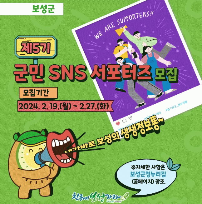보성군은 오는 2월 27일까지 ‘제5기 군민 SNS 서포터즈(홍보단)’를 모집한다고 밝혔다.