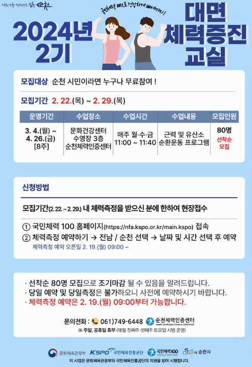 체력증진교실 모집 및 센터 이용 문의는 순천체력인증센터로 하면 된다.