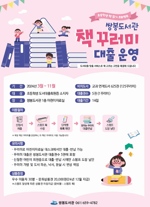 ‘책 꾸러미 대출’은 초등학생 단계별 교과 연계도서를 꾸러미로 대출해 주는 사업으로 도서대출회원이라면 쌍봉도서관 1층 어린이자료실에서 신청할 수 있으며 대출기간은 14일이다.