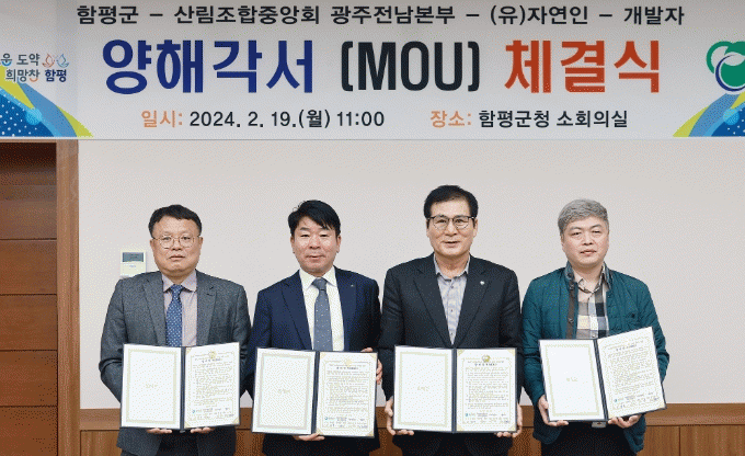 이날 MOU 체결식에는 이상익 함평군수, 한민 산림조합중앙회 광주전남본부장, 전철 (유)자연인 대표와 개발자로서 석주원 씨가 참석해 적송이 버섯육성을 위한 상호 협력을 약속했다.