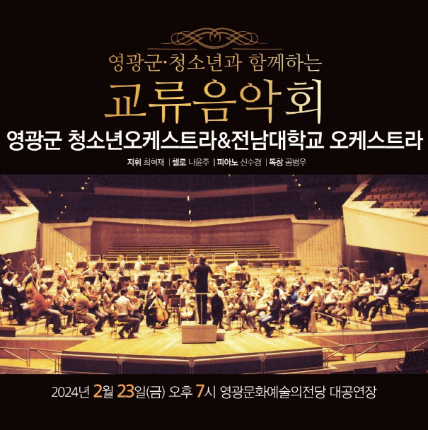 영광군은 오는 23일 오후 7시, 영광문화예술의전당 대공연장에서 영광군 청소년오케스트라와 전남대학교 오케스트라가 함께하는 교류음악회가 열린다고 밝혔다.