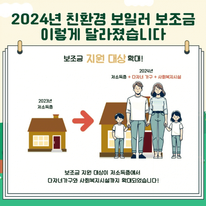 ‘가정용 친환경 보일러 설치비 지원 사업’은 대기오염물질 저감 효과와 에너지 효율이 좋은 가정용 친환경 보일러를 저소득 취약계층에 보급하여 대기환경 개선과 취약계층 난방비 부담 경감을 위해 실시되는 사업이다.