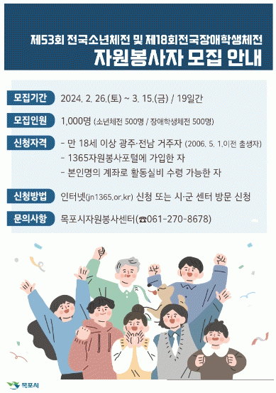 자원봉사자는 오는 26일부터 3월 15일까지 19일간 모집하며, 신청자격은 광주·전라남도 18세 이상(‘06. 5. 1일 이전 출생자)거주자로, 1365 자원봉사포털 시스템 필수 가입절차를 거쳐, 활동실비를 수령하기 위한 본인명의 계좌를 개설한 경우에 한해 신청이 가능하다.