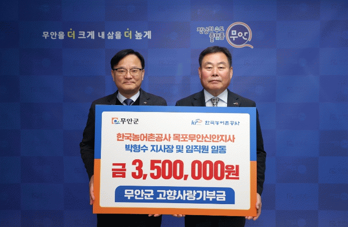 박형수 지사장은 “고향이나 직장을 통해 무안군과 인연을 맺은 직원들이 무안의 발전에 힘을 보태고자 작은 마음을 모아 고향사랑기부제에 동참하게 됐다”며, “무안군 고향사랑기부제가 지역 발전을 견인하는 마중물이 될 수 있도록 깊은 관심과 동참 유도를 아끼지 않겠다”고 말했다.