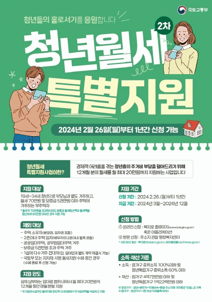 청년월세 한시 특별지원사업 신청은 2024년 2월 26일부터 예산소진 시까지 주소지 읍면 사무소 또는 온라인(복지로)에서 신청하면 된다. 지급 대상자로 선정되면 12개월간 매월 25일에 실제 납부하는 임대료 범위 내에서 최대 20만 원씩 지원된다.