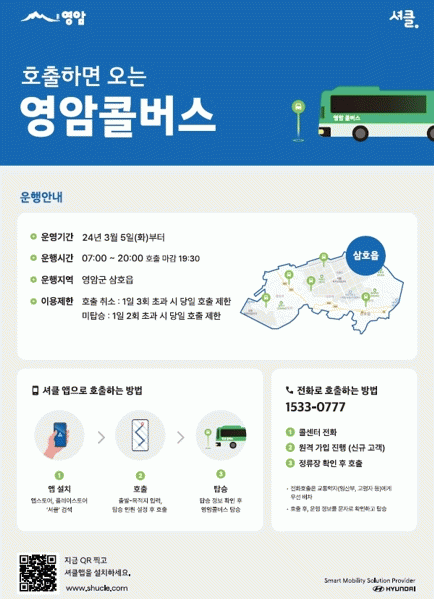 영암군이 다음달 5일부터 삼호읍에서 오전 7시부터 저녁 8시까지 ‘영암콜버스’ 3대를 시범 운행한다.
