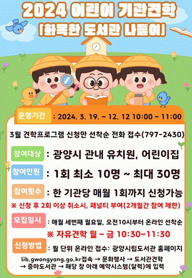 김미라 도서관과장은 “어린이 견학 프로그램을 통해 아이들이 책 읽는 즐거움을 느끼고 도서관과 친해질 수 있도록 유아 교육기관의 많은 신청을 바란다”고 말했다.