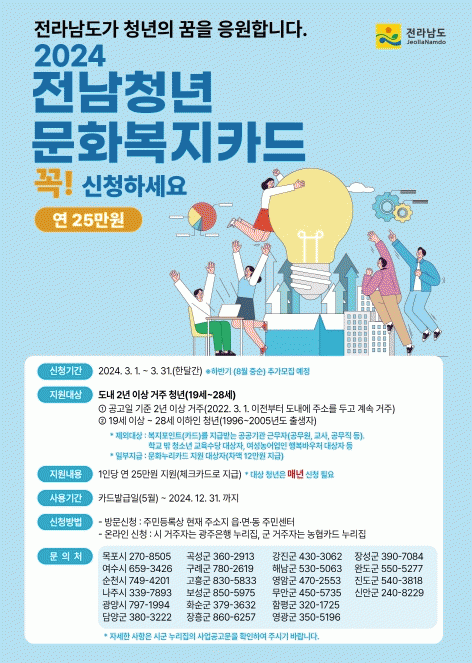 신청대상은 2022년 3월 1일 이전부터 전남 도내에 2년 이상 주소를 두고 있는 19~28세 청년(1996년~2005년 출생자)이며 전년도 선정자도 자격요건 확인을 위해 올해 새로 신청을 해야 한다.