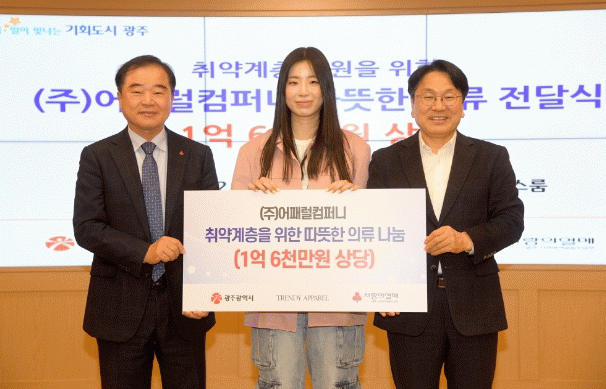 전달식에는 강기정 시장을 비롯해 ㈜어패럴컴퍼니 김민주 대표, 김한길 이사, 김이연 상무, 광주사회복지공동모금회 박철홍 회장 등이 참석했다.