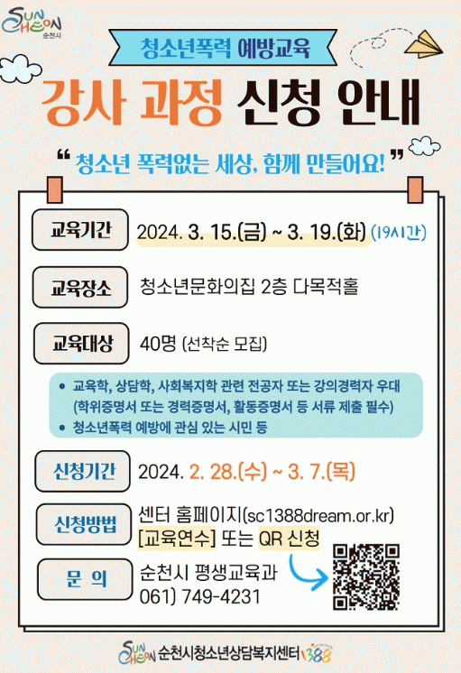 신청 기간은 오는 28일부터 3월 7일까지이며, 순천시청소년상담복지센터 홈페이지를 통해 선착순으로 모집한다.
