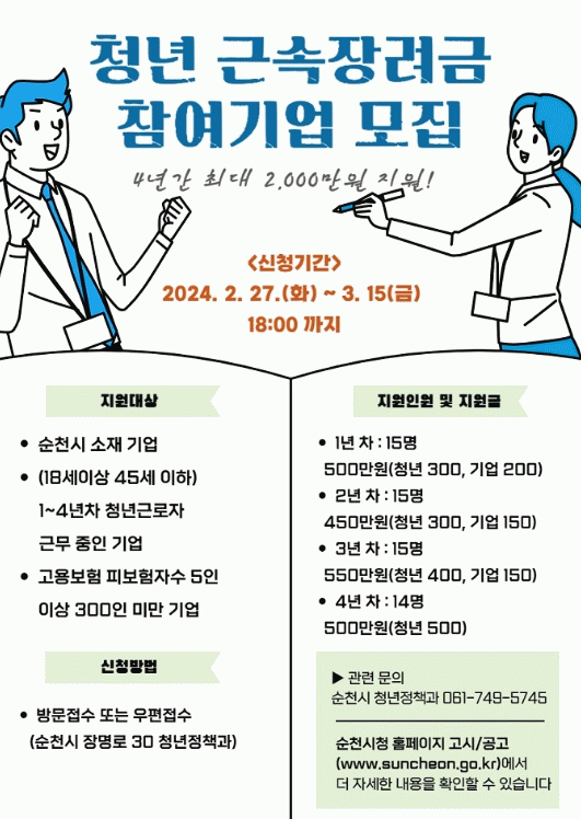 신청 대상은 순천시에 소재한 고용보험 피보험자 수 5인 이상 300인 미만 기업과 당해 기업에서 정규직으로 근무하고 있는 18세 이상 부터 45세 이하 청년이다.