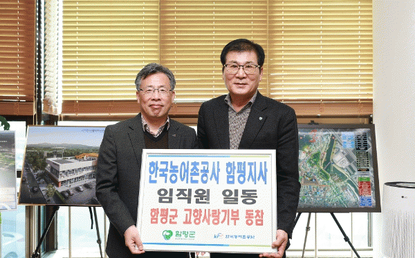 26일 함평군에 따르면 서정진 한국농어촌공사 함평지사장을 비롯한 전 직원이 지난 13일부터 19일까지 함평군에 고향사랑기부금을 기탁했다.