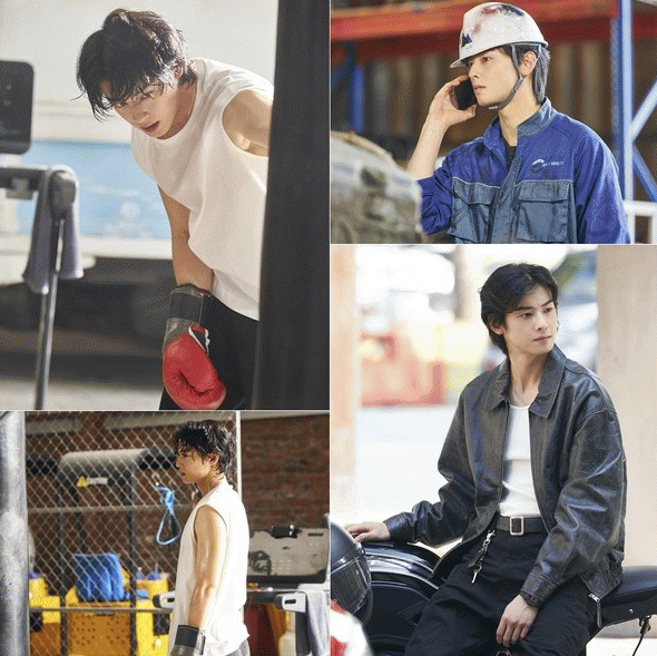 땀으로 범벅이 된 머리카락, 검을 그을음이 잔뜩 묻은 작업복, 무심하게 오토바이에 걸터앉은 모습 등, 처음 만나는 차은우의 거친 모습이 보는 이에게 신선한 매력을 선사한다.