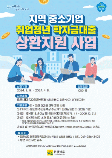 신청 자격은 공고일(2월19일) 기준 전남에 주소를 둔 만 18세 이상 만 45세 이하 청년이다. 도내 중소기업에 근무하고 현재 한국장학재단의 학자금대출을 상환하고 있으면 신청할 수 있다.
