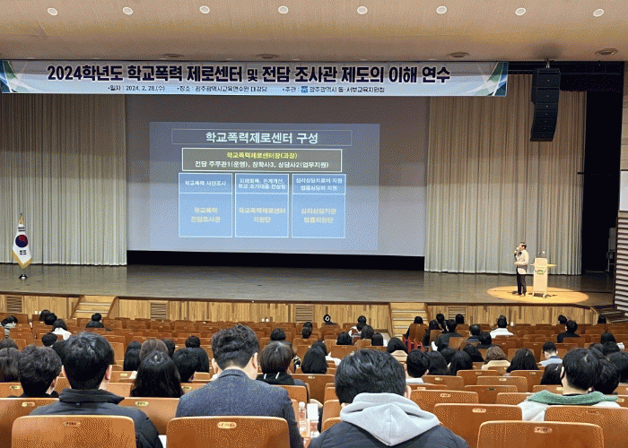 한편 광주동·서부교육지원청은 2월 28일 학교 현장에서 학교폭력제로센터 운영에 대한 이해를 돕기 위해 학교 교감 및 학생생활부장 대상 연수를 실시했다. 이를 통해 제로센터 구축 현황 및 운영 사업에 대한 안내와 학교폭력 사안 처리에 대한 주요 개정 사항을 안내했다.