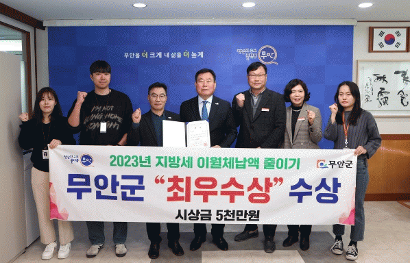 이번 평가에서 무안군은 이월체납액 2,900백만 원 대비 1,775백만 원을 징수하여 징수율 61.2%를 달성 했고, 전년 대비 징수율이 7.57% 증가하여 각 평가 항목의 총점이 92점으로 전남 전체 1위를 달성했다.