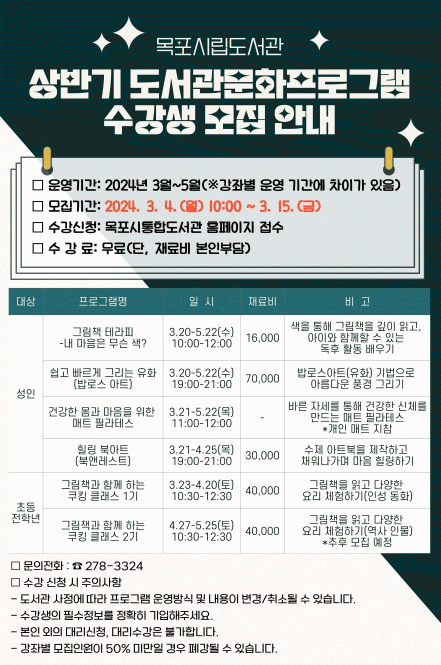 수강 신청은 오는 3월 4일부터 15일까지 목포시통합도서관 누리집에서 가능하며 모든 강좌는 무료(단, 교재비 및 재료비 본인 부담)이다.