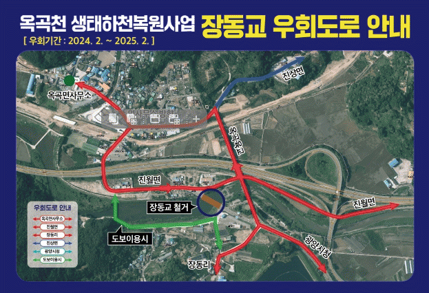 교량 통행 제한에 따라 차량은 기존 도로와 연결이 가능한 옥곡6교 이용하고, 보행자는 기존 횡단 목교를 이용하도록 우회도로 안내를 통해 시민 불편을 최소화할 계획이다.