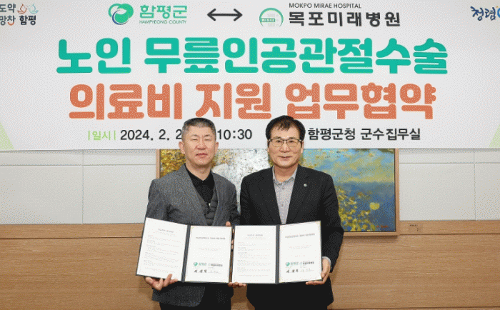 이번 협약은 만 60세 이상 관내 어르신의 무릎인공관절 수술 진료비 경감을 위해 체결됐으며 목포미래병원에서는 비급여 진료비의 10%를 감면한다.