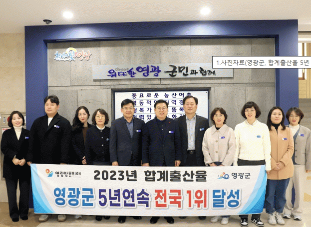 지난 28일 발표한 통계청 자료에 따르면 2023년도 전국 출생아수는 23만여 명이며, 전국 평균 0.72, 전남 0.97로 영광군은 전국 평균의 두 배를 뛰어넘는 수치를 기록하여 ‘아이 낳고 키우기 좋은 영광’임을 다시 한번 입증했다.
