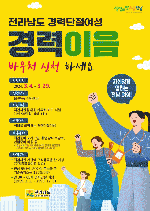 지원 대상은 신청일 기준 전라남도에 1년 이상 주소를 두고, 취업 지원기관(여성새로일하기센터, 고용복지플러스센터 등)에 구직 등록한 만 30세 이상 65세 이하로, 재취업을 희망하는 중위소득 150% 이하 경력 단절 여성이다.