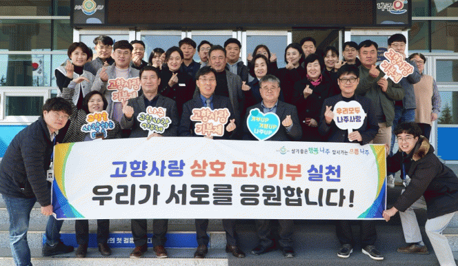 나주시는 나주시와 담양군 양 기관 도시과 직원 간 고향사랑기부제 상호 기부를 계기로 업무 정보 및 동향을 공유하는 등 상호 협력하기로 했다고 29일 밝혔다.