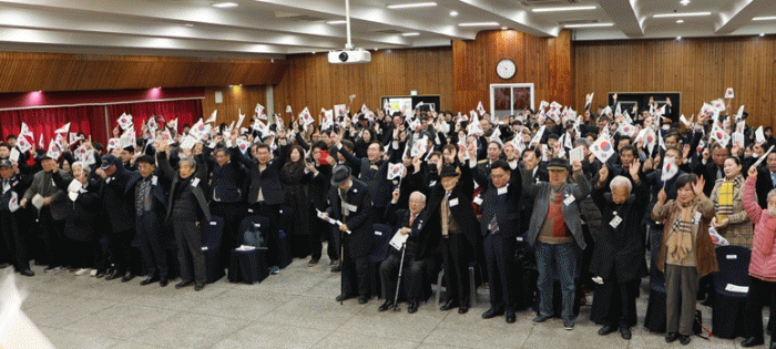 독립유공자 후손, 유족들과 시민들도 자리에서 일어나 태극기를 휘날리며 대한독립 만세를 외쳤다.