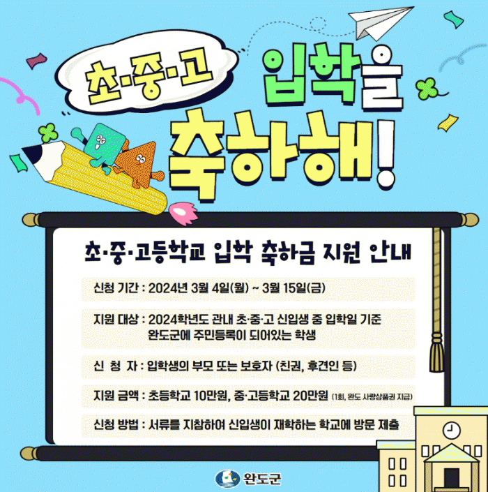 입학 축하금은 완도사랑상품권으로 지급되며, 초등학생에게는 10만 원, 중·고등학생에게는 20만 원이 각 1회 지급된다.