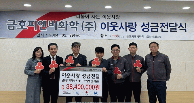 한편, 금호피앤비화학(주)는 지난 2015년부터 지역사회를 위한 나눔 활동에 적극 동참해오고 있으며 현재까지 총 4억 4520여만 원의 성금을 전달했다.