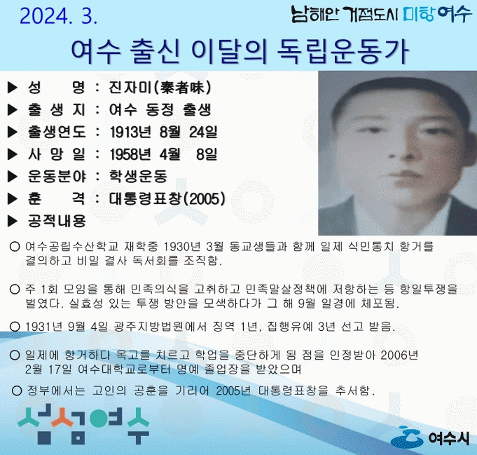 ‘진자미 선생’은 여수공립수산학교 재학 중이던 1930년 3월 동교생들과 함께 일제 식민통치 항거를 결의하고 비밀결사 독서회를 조직했다. 매주 1회 모임을 통해 민족의식을 고취하고 민족말살정책에 저항하는 등 항일투쟁을 벌였다.