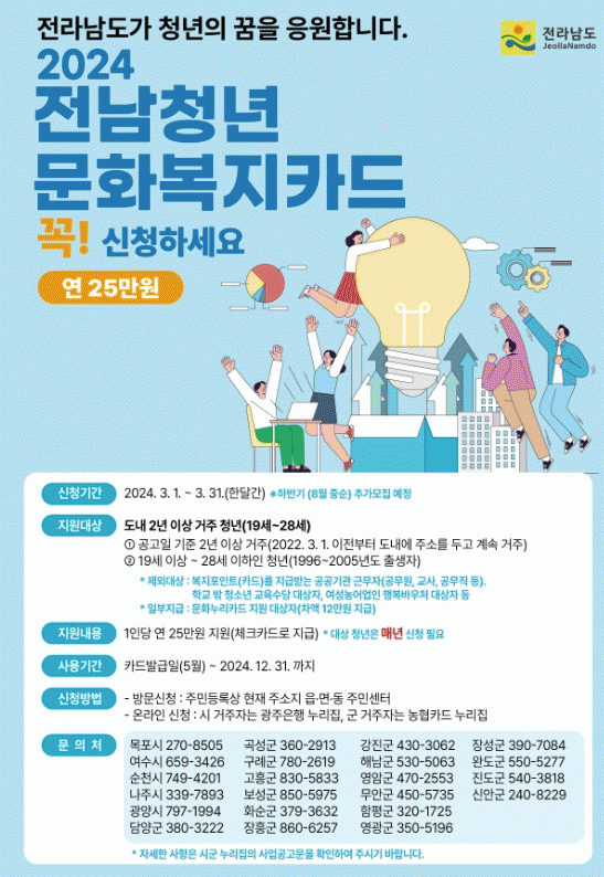 이들은 문화복지카드를 이용해 전남 도내에서 도서 구입, 체육시설 이용, 학원 수강, 공연 관람, 숙박시설 이용 등 다양한 문화복지 활동에 자금을 사용할 수 있다.