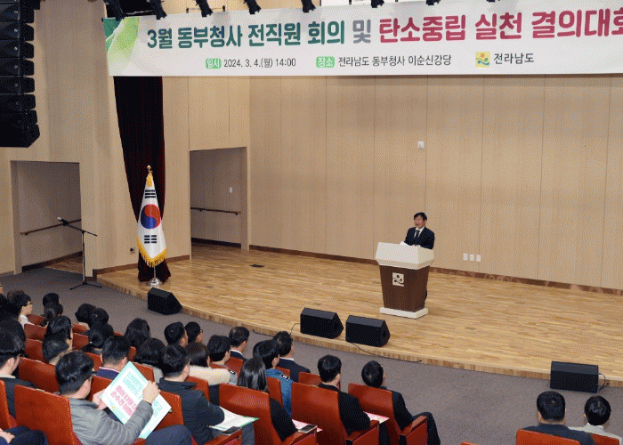 전남도는 4일 정찬균 동부지역본부장을 비롯한 직원들이 탄소중립 실천 결의문을 낭독하고, 일회용컵 대신 개인 다회용컵 이용하기, 보고서 양면인쇄 등 10가지 실천 수칙에 적극 동참할 것을 다짐하는 결의대회로 탄소중립 주간을 시작했다.