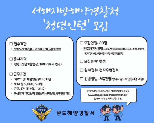 서해해경청에서 채용하는 청년인턴은 지역의 청년들이 고르게 참여할 수 있도록 행정 분야 총 38명을 모집할 예정이며 이들은 단순 보조 업무가 아닌 행정, 홍보 등 다양한 전문분야에서 6개월 간 청년인턴으로 해양경찰 직원들과 함께 일할 예정이다.