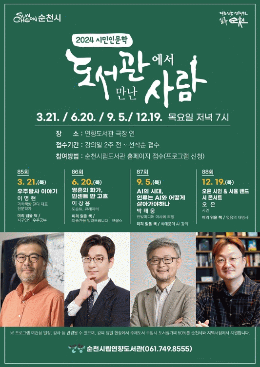 강의 신청은 오는 7일부터 순천시립도서관 홈페이지를 통해 가능하다. 순천시민 누구나 신청할 수 있으며, 선착순으로 200명을 모집한다.